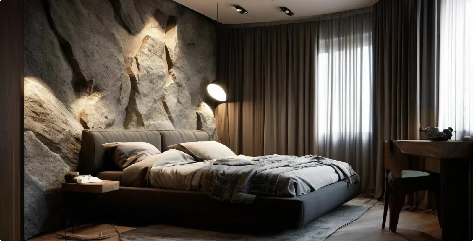 • Скала в изголовье кровати создает атмосферу надежности и спокойствия.