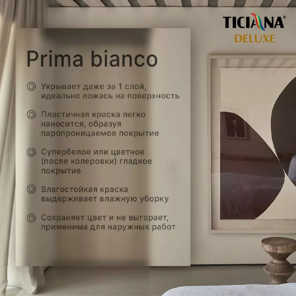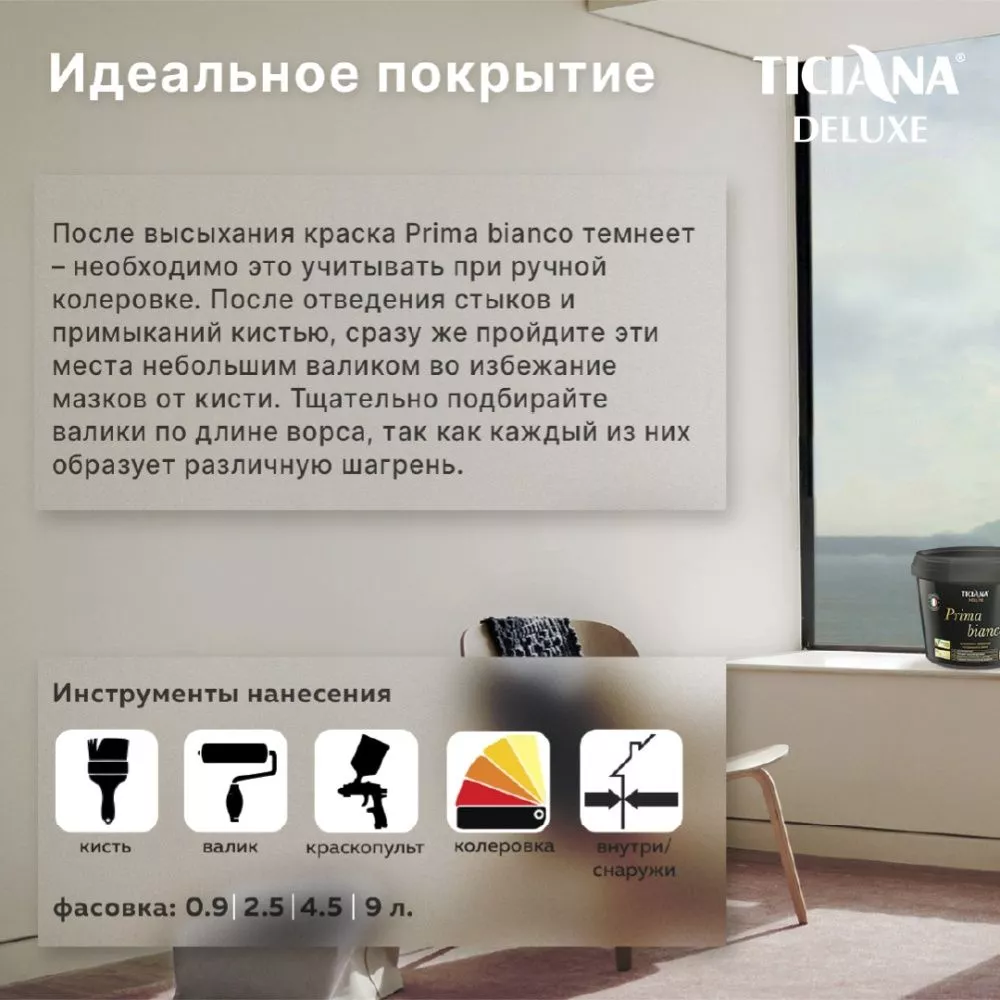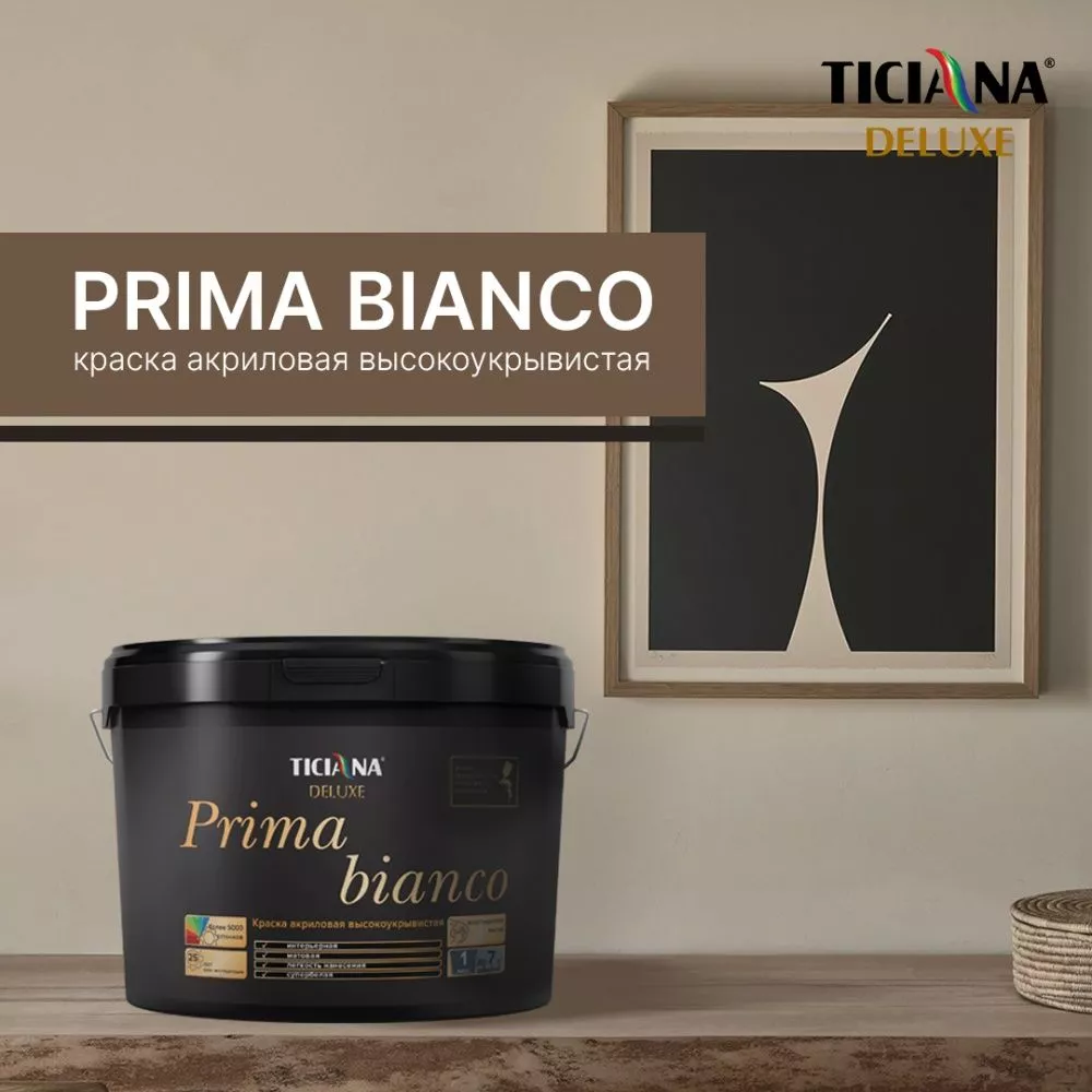 Высококачественная краска на основе акриловой дисперсии для внутренних и наружных работ. Высокоукрывистая, экологически чистая, водоразбавляемая, легко наносится, с отличной адгезией к большинству поверхностей. Изготовлена по немецким технологиям на оборудовании фирмы Netzsch. Предназначена для окрашивания стен и потолков в жилых и общественных помещениях – бетонных, оштукатуренных, гипсокартонных, кирпичных и других минеральных поверхностей, а также для окрашивания фасадов зданий и сооружений. Образует супербелое (база А) или цветное (база А и С после колеровки) гладкое покрытие. Обладает особо высокой укрывистостью. Легко наносится, образует паропроницаемое покрытие. Колеруется пастами Ticiana mix. Не имеет резкого запаха и абсолютно не токсична.