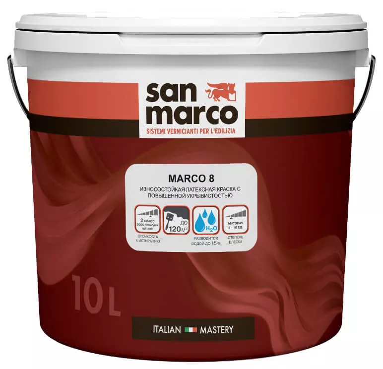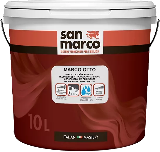 Marco Otto - пециально разработанная формула краски идеально подходит для профессионального использования при работе на больших поверхностях, в том числе с краскопультом. Поверхность, покрашенная данной краской выдерживает повышенные механические нагрузки и частую влажную уборку с моющими и чистящими средствами. Имеет сертификат, разрешающий применение в детских и лечебно-профилактических учреждения